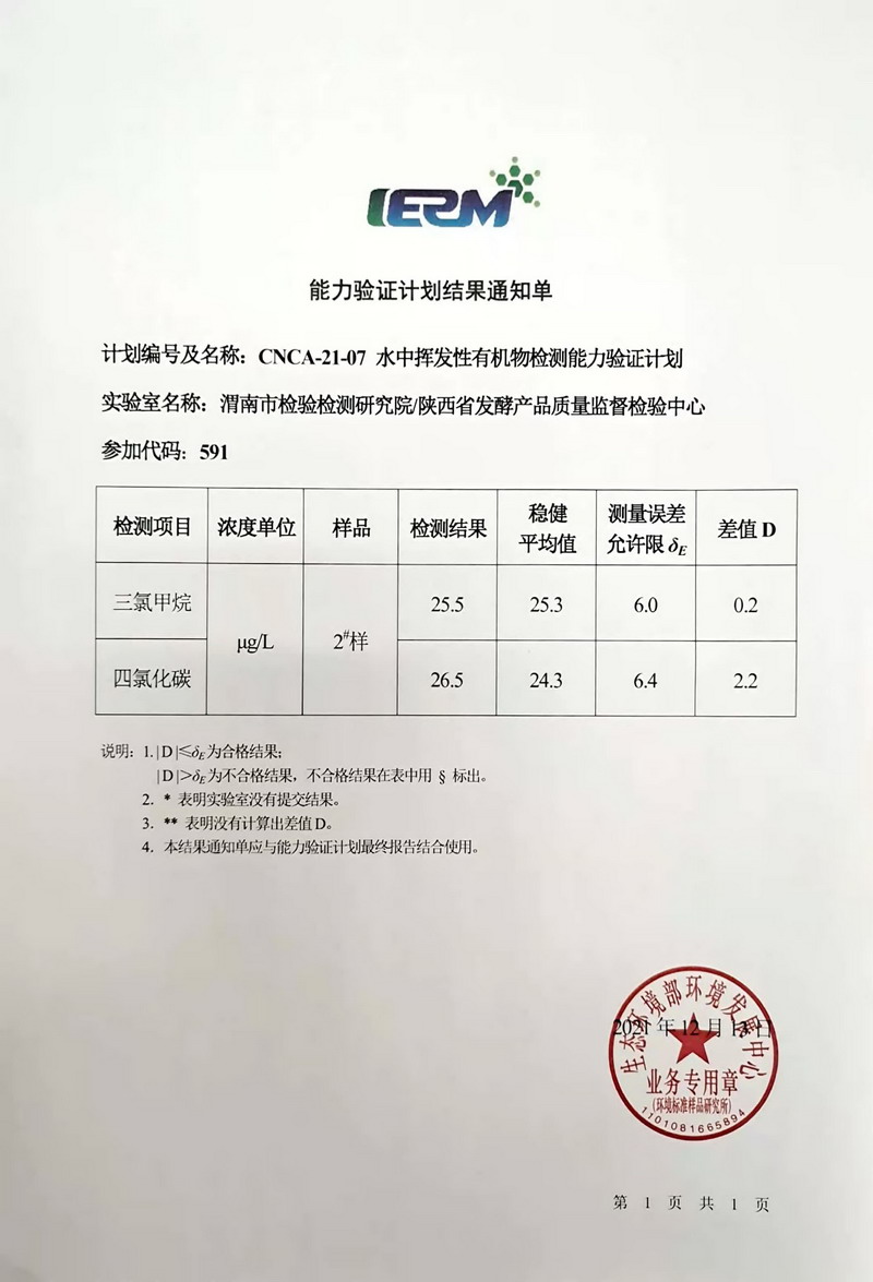 按照《2021年国家市场监督管理总局组织开展的国家级检验检测机构能力验证计划》,渭南市检验检测研究院产品质量监督检验中心暨授权的陕西省发酵产品质量监督检验中心,积极组织人员开展了本年度国家生态环境部环境发展中心环境标准样品研究所发布的“水中挥发性有机物检测”能力验证项目。质检中心依托完善的能力验证实施方案,在接收样品后72小时内,检测人员刘锋军、王杨阳有序高效的完成了“三氯化碳、四氯甲烷”检测参数上报工作。所提交的检测结果为首测合格(满意)。