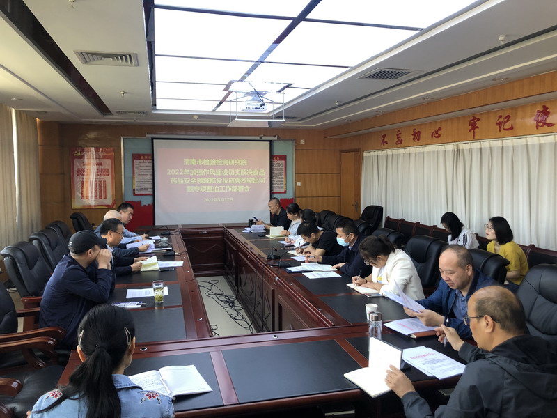 5月17日上午,渭南市检验检测研究院召开专题会议,安排部署加强作风建设切实解决食品药品安全领域群众反映强烈突出问题专项整治工作。院长梁金星主持会议,院领导、各检测中心主任,机关全体人员参加。