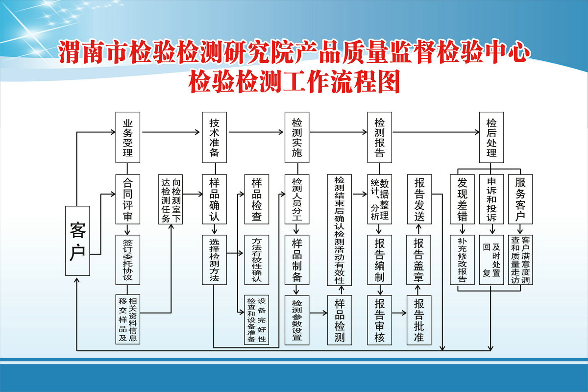 办事流程:1、客户申请:客户在一楼大厅业务接待窗口填写《渭南市检验检测研究院委托送样检验合同书》。